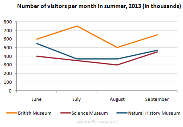 The line graph below gives information about the number of visitors to three London museums between June and September 2013.